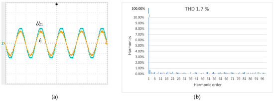 (a) Experimental results of AC voltage and AC current, and , in steady state with the averaged backstepping controller. Converter connected to a distributed power source. Vertical: 2 A/div and 20 V/div. Horizontal: 10 ms/div; (b) Experimental result of AC current, , THD.