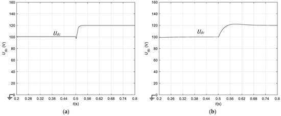 When the DC reference voltage steps up from the lower operating value (100 V) to the upper operating value (120 V) at time t = 0.5 s, the simulated DC voltage transient behavior, using the averaged backstepping controller, is displayed in Figure 7a. The response time is found to be nearly 15 ms. Using the separate dynamics controller, the results are nearly the same, with the absence in Equation (23) of the DC voltage error, , having very little effect. For performance comparison purposes, Figure 7b shows the results of standard linear control based on SPWM, coupled to PI controllers, which has a response time of approximately 45 ms and some overshoot.