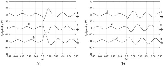 Simulation results of the AC currents, , , and , in transient mode, when the reference changes from 100 V to 120 V: (a) With the averaged backstepping controller; (b) With PI controller.