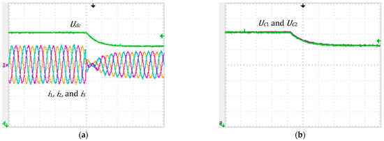 Experimental results in transient conditions when the reference changed from 120 V to 100 V, with the averaged backstepping controller: (a) DC voltage and AC currents, , , and , vertical: 2 A/div and 20 V/div; (b) Capacitor voltages, and , vertical: 10 V/div. Horizontal: 25 ms/div.