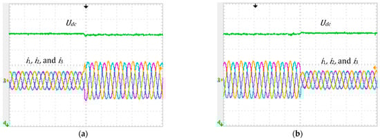 Experimental results of DC voltage and AC currents, , , and , with the separated dynamics backstepping controller: (a) Subjected to a step change in the current from 1.2 A to 2.4 A; (b) Subjected to a step change in the current from 2.4 A to 1.2 A. Vertical: 2 A/div and 20 V/div. Horizontal: 25 ms/div.