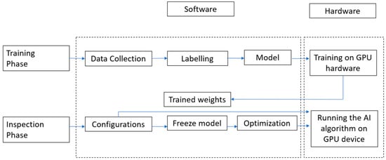 Figure 8 below adapted from a paper on autonomous patrolling drones [44] for fault detection shows the MIDRAS [45] drone used for their experiment and an adapted model for training and operating the AI. This can be adapted for drone detection and be used for its initial use case. The YOLOv4 model is their model to detect faults and they use other AI models in the inspection phase.