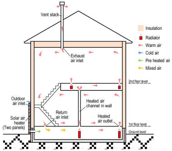- Matsunaga, J.; Kikuta, K.; Hirakawa, H.; Mizuno, K.; Tajima, M.; Hayashi, M.; Fukushima, A. An Assessment of Heating Load Reduction by Solar Air Heater in a Residential Passive Ventilation System. Energies 2021, 14, 7651. [Google Scholar] [CrossRef]