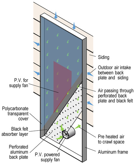 The most important feature of the PVSAH is that it lacks air conveying fan power. In addition, by using SAH for air supply, the system reduces ventilation load. In addition, the system requires no maintenance, such as filters, and thus has a low maintenance burden. The passive ventilation system fluctuates according to the temperature difference between indoors and outdoors and the outside wind. Especially during the daytime, the outdoor temperature rises and the temperature difference between the indoor and outdoor parts of the room decreases, which results in decreased ventilation. However, since it is in operation, the SAH acts as a source of ventilation to compensate for the reduced volume of ventilation.