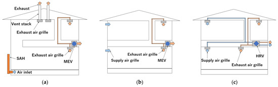 Table 1 and Figure 3 list the systems considered and evaluated in this study. We selected the proposed PVSAH, HRV, and MEV, which are the generally available ventilation systems of choice. In Japan, MEVs are generally adopted in large numbers, but the use of HRVs has been increasing in recent years as homes have become increasingly sophisticated. In the energy conservation standards in Japan, the air conveying fan power of a ventilation system is evaluated as an SFP. Specifically, the SFP indicates the amount of energy that can be conveyed with 1 m3 of air. The study used the default values of SFP and heat exchange efficiency in the Japanese energy conservation standard [19]. PVSAH displayed a lower capacity for natural ventilation in the middle of the year and in the summer, when the temperature difference is small. Therefore, the evaluation of the SFP was conducted under conditions in which the MEV was operated and ventilated during the intermediate and summer seasons. Ventilation frequency was set to 0.5 h−1, which was also the standard value in Japan and obtained from an international survey on ventilation frequency [20]. The heat collection efficiency of the SAH in the PVSAH was 60% according to the indication of the manufacturer, but the heat collection efficiency was obtained through Equation (4). Actual measurements in the previous paper [18] showed 58%. The current study calculated heat collection efficiency through simulation to obtain Qu. We calculated a total floor area of 120 m2 and a building volume of 288 m3. The building was examined under the same conditions, and the building envelop load was the same. Therefore, we did not examine the envelop load but only the ventilation load.
