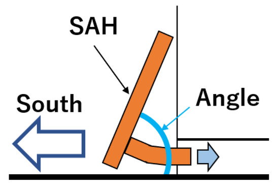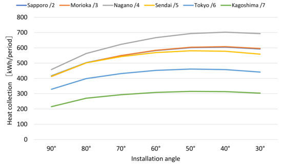 The study examined the optimal installation conditions for SAH. Panels can be installed not only on the wall but also at an angle. Figure 4 illustrates the calculated heat collection during the heating period according to the angle of the installation. As shown in Figure 5, the installation angle is 90° for vertical (wall installation) and 0° for horizontal, relative to the ground. The heat collection rate increases as the angle becomes slower. In each zone, the maximum heat collection angle is 40° to 50°, in which case the heat collection rate is 40% to 50% higher than that for wall installation. However, at less than 70°, the rate of increase in the heat collection rate decreases, and the rate of increase of the maximum heat collection rate from the heat collection rate at a 70° installation is approximately 10%. Conversely, a 30-degree angle resulted in a decrease in heat collection compared with a 40-degree angle.