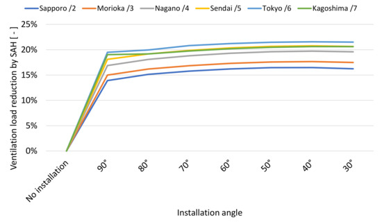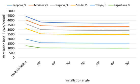 Figure 6 and Figure 7 depict the ventilation load by the angle of the PVSAH installation during the heating season and the percentage reduction in ventilation load, respectively. Installing the SAH on the wall (90°) reduces ventilation load by 15–20%. In this study, heat collection that exceeds the ventilation load did not lead to a reduction in ventilation load. Therefore, when mounted on a building, the increase in heat collection due to the installation angle exceeds the ventilation load and is passed on to the auxiliary heating effect. Even if the heat collection rate is increased by lowering the installation angle compared with that of the wall installation, the reduction rate is only 2–3% at maximum. Given the effects of snow accumulation in cold regions, strong winds such as typhoons in hot and humid regions, and obstruction caused by protrusion from buildings, a wall installation (90°) was considered, which is advantageous from a design standpoint. However, excess heat collection (overheating) by the SAH beyond the ventilation load contributes to energy savings as supplemental heating. Therefore, if conditions permit, an angled installation at no additional cost would be more desirable because it would increase energy efficiency.