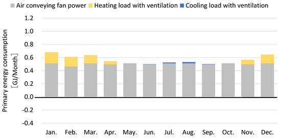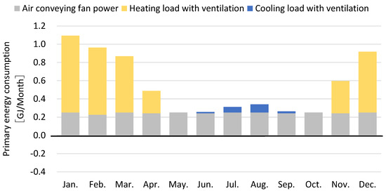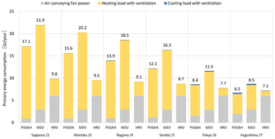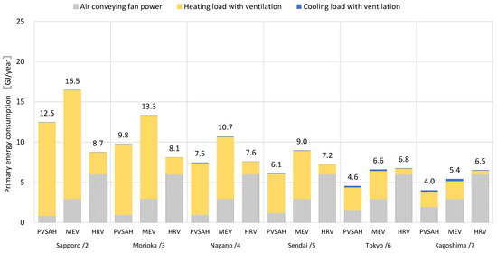 Conversely, HRV consumes air conveying fan power throughout the year, even during periods without the heating load, and consumes significantly more energy than the ventilation load. In addition, the ventilation load during summer cooling is relatively small compared with the reduced ventilation load in winter, and energy savings are limited. As a result, the annual primary energy consumption of the HRV was 6.8 GJ/year, which is 0.2 GJ/year more energy than that of the MEV, and the HRV consumed significantly more energy than the PVSAH.