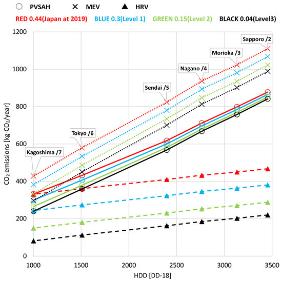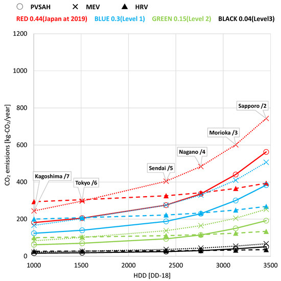 - The CO2 emissions of different ventilation systems were compared. In the case of gas heating + heat pump cooling, the change is small, despite the change in the CO2 emission factor of electricity, because the gas combustion energy efficiency of the heating remains the same. Therefore, HRV is significantly more advantageous because heating energy can be significantly reduced. In the case of heat pump cooling and heating, however, HRV poses an advantage in cold climates but a disadvantage in warmer climates because the amount of air conveying fan power does not decrease. HDD 1500 and below: PVSAH > MEV > HRV; HDD 1500 to 2750: PVSAH > HRV > MEV; and HDD 2750 and above: HRV > PVSAH > MEV, in this order. In addition, as the CO2 emission factor decreases, the difference in CO2 emissions between systems decreases. If the difference in emissions becomes smaller, then considering the initial and running (including maintenance and upkeep) costs and the risk of failure of the system is crucial. A simple system configuration with low risks of failure and maintenance, such as PVSAH, may prove advantageous in the future.