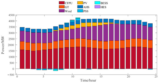 Within Scenario A, pumped storage stations generate electricity during the busy peak load period from 09:00 to 12:00 while pumping water for storage during the off-peak period from 04:00 to 08:00. Wind power generation from 14:00–20:00 is large, which is consistent with the load curve. It can be seen from Figure 2 and Figure 3 that the flexibility demand of the system is large from 09:00 to 11:00, and the pumped storage stations, battery energy storages and hydrogen storage discharge during this period provide upward flexibility.