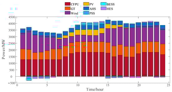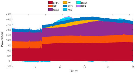 As shown in Table 1, a RRGT can provide flexible resources for a 1 min time scale and 15–60 min time scale. A CCGT can provide flexible resources with a time scale of 15~60 min. A CFPU can only provide flexible resources with a time scale of 1 h. An AHS and various types of energy storage (PSS, BESS, and HES) provide flexibility for 1 min timescales and 15–60 min timescales.