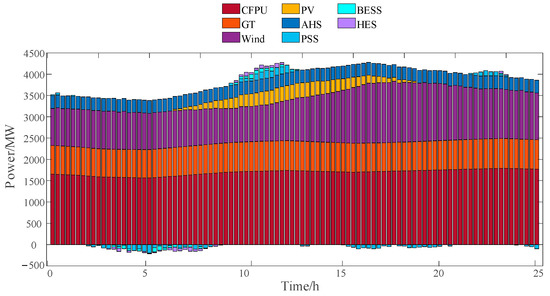 In Scenario B, as shown in Figure 4 and Figure 5, the renewable generation enlarges the peak-to-valley difference. The flexibility demand of the system is larger in comparison to that of Scenario A. Therefore, the pumped storage stations, battery energy storages and hydrogen storages generate power during the system load peak period to balance the system’s upward flexibility demand and absorb power during the off-peak period to balance the downward flexibility demand.