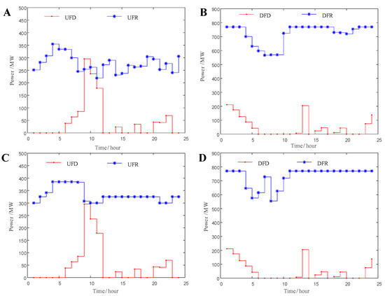 System flexibility supply and demand. (A) UFR and UFD without considering flexibility constraints; (B) DFR and DFD without considering flexibility constraints; (C) UFR and UFD under flexibility constraints; (D) DFR and DFD under flexibility constraints.