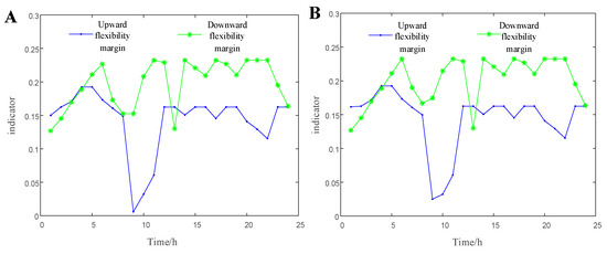 The system flexibility margin, without considering the system flexibility margin index constraints, is shown in Figure 9A. The system flexibility margin under system flexibility margin index constraints is shown in Figure 9B. In Figure 9A, the upward flexibility margin index and downward flexibility index ranges are [0.005,0.193] and [0.025,0.205], respectively. In Figure 9B, the system flexibility margin is larger than that in Figure 9A, because the flexibility index constraints can guarantee that the flexibility margin is not below the threshold. To meet the flexibility demand during the day, it is necessary to consider the flexibility margin index constraints to cope with the uncertainty of renewable energy output.