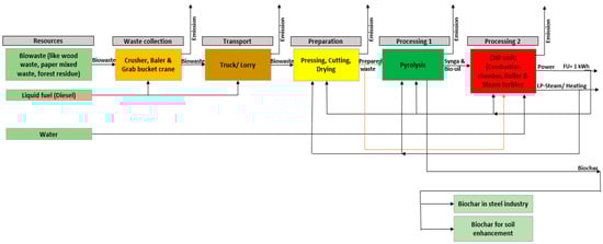 By utilizing life cycle assessment (LCA), it is possible to measure the environmental effects of a product, service, or activity throughout its entire life cycle, including indirect impacts [32,33,34]. In this study, LCA was used to assess and compare the potential environmental impacts of biomass combustion and biomass pyrolysis in Sweden, Italy, and Poland, following the procedures recommended by ISO 14040 [35] and ISO 14044 [36]. These countries were selected since they include different systems for electricity production which leads to different carbon footprints. In Sweden, hydropower and nuclear energy are the dominant sources of electricity. In fact, around 50% of Sweden’s electricity comes from hydropower plants, while over 30% is generated from nuclear power plants. The remaining electricity comes from wind farms and other renewable sources such as solar energy and bioenergy. Italy relies heavily on natural gas for electricity production, with over 40% of its electricity coming from gas-fired power plants. Poland’s electricity production system is heavily reliant on coal, which accounts for over 70% of the country’s electricity mix. The remaining electricity comes from natural gas and renewable sources such as wind power and hydropower. Poland has been slow to transition to renewable energy due to its reliance on coal and concerns about energy security.