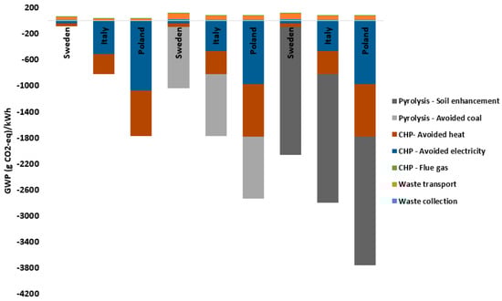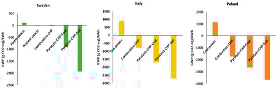 The results obtained in this study rely heavily on the assumptions made and the data presented in the preceding section. In Figure 2, a comprehensive comparison of the climate impacts of four distinct systems has been provided. These systems include the existing electricity system, biomass combustion integrated with Combined Heat and Power (CHP), biomass pyrolysis integrated with CHP, using biochar as a product for soil enhancement and replacing coal in the steel industry, in Sweden, Italy, and Poland. The comparison made in the figure is based on total greenhouse gas (GHG) emissions that result from each system’s life cycle, ranging from waste collection to energy production, heat and electricity generation, and biochar product manufacturing.