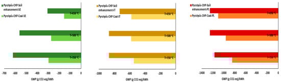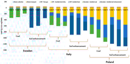 More specific aspects can be observed in Figure 5, which displays the GWP contributions of different processes for two biochar implementations. In Sweden, as temperature rises, CO2 uptake from both avoiding coal and soil enrichment decreases, while the impact from avoiding heat and electricity gradually increase. This indicates that utilizing BP+CHP at 350 °C for soil enrichment in Sweden will result in the greatest GHG reduction compared to other options. Conversely, the effects of avoiding heat and electricity vary significantly with increasing temperature for Italy and Poland, and are most prominent when using BP+CHP at 650 °C for soil enrichment in Poland.