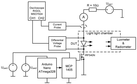 For the investigations of the considered power LEDs, a test set-up was used, the block diagram of which is shown in Figure 1. It consists of a power supply block for the tested power LEDs and a measurement block. The power supply block consists of the laboratory power supply TRP6010S by NDN, connected in a series with a resistor of R = 10 Ω resistance limiting the current flowing through the tested power LED and the RIGOL DM3058 mm enabling the measurement of the RMS value of the current flowing through the Device Under Test (DUT). In order to enable the simultaneous change of frequency and the duty cycle of the rectangular pulse trains of the control signal, a generator was constructed for the experimental investigations containing the Arduino NANO 3.0 module with the ATmega328 microcontroller. The applied generator, in contrast to the available commercial instruments, made it possible to regulate the value of the duty cycle in a very wide range—from 1% to 99%. For commercial instruments, such a range is from 20% to 80%. The value of the duty cycle is regulated by an encoder, similar to the value of frequency. The IRF540N type MOSFET was used to switch the current supplying the tested power LED. The gate of this transistor was controlled by the MCP1405 driver.
