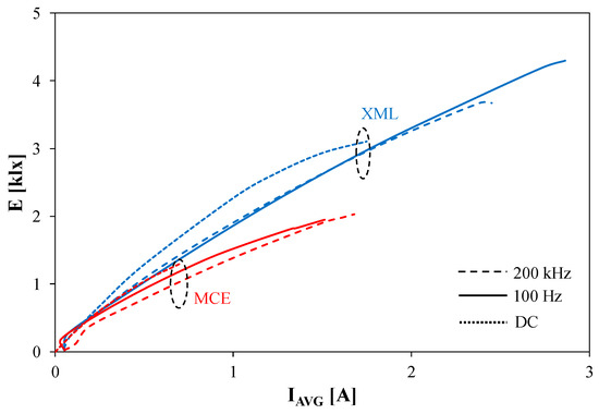 It can be seen that the highest illuminance value was obtained when the LEDs were powered with the direct current. All the presented E(IAVG) dependences are monotonically increasing functions. An increase in the frequency causes a decrease in the value of E. This phenomenon is associated with the phenomenon of self-heating and a decrease in the illuminance value with an increase in the junction temperature of the LED [19]. For the MCE series LED, at f = 200 kHz and IAVG = 0.7 A, the illuminance has 5% lower values compared with the values measured with the DC power supply. In the case of the XML series LED, the increase in the E value is 10% for the same parameters of the power supply. The observed influence of the frequency on the values of illuminance is connected with a delay between the electrical and optical processes in the tested LEDs.
