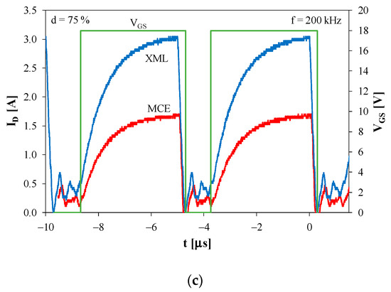 Figure 15. Waveforms of voltage VGS controlling the gate of the transistor and the supply current ID of the tested diodes at selected frequency values equal to: (a) 100 Hz, (b) 100 kHz, (c) 200 kHz.