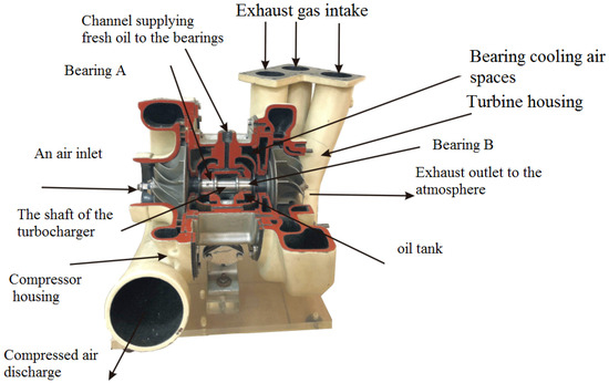 As the current literature on the subject indicates, most of the conducted research and considerations in the field of operation of drive units has focused primarily on changing the toxicity and improving the ecological parameters [1,2,3,4]. However, an important topic concerning the role of currently used drive units and emerging operational problems, in particular the dynamic properties of engines, is still omitted [5,6]. In the case of thermal machines, including internal combustion piston engines, the power of an engine is determined by the amount of fuel supplied to it. The combustion of fuel is limited by the content of oxygen, which accounts for 21% of air. For this reason, the process of supplying the appropriate amount of air in connection with the engine load is very important. The amount of supplied air is regulated by means of changing the degree of air compression. Internal combustion piston engines are characterised by variable operating conditions (variable revolutions and variable load). This is why, for the purpose of regulating the amount of air required for the expected quality of the performed operational task, turbochargers designed individually for each type of power unit (engine) are used. The task of supplying air to the engine is performed by a rotating assembly consisting of a turbine and compressor rotors mounted on one shaft. The amount of compressed air depends, among other things, on the rotational speed of the shaft, temperature of air, and the parameters of the engine’s exhaust gas stream, i.e., pressure and temperature. The turbocharger rotors [7] rotate at a speed of up to tens of thousands of revolutions per minute (rpm) depending on their design, including the shape of the blades, heat load, and diameters (smaller diameters, higher revolutions). Owing to the fact that turbochargers are subjected to high thermal and dynamic loads, their construction, the selection of the materials of which their parts are made, the quality of production and assembly, as well as the optimal selection and preparation of the operating parameters of the media (e.g., lubricating oil) are of special importance. An incorrectly selected, malfunctioning, or out of service turbocharger may cause thermal overload of the engine, and consequently, limit or stop its operation. This is especially important on vessels (where maintaining controllability and lateral stability is crucial) and technical objects, as well as in special purpose and military vehicles operating in difficult, dangerous, and specific conditions. Therefore, the authors of this paper decided to research the durability and reliability of turbochargers used in multi-cylinder internal combustion piston engines with the aim of extending the service life and indirectly the durability and reliability of driving engines of special purpose technical facilities.