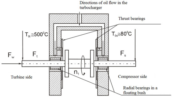 The centre housing is the main structure to which the compressor and turbine housings are attached. Oil covers are screwed on both sides of the bearing housing. In this way, an airtight chamber is formed to which oil leaking from the bearings flows. Next, the oil continues to flow to the lower part of the bearing housing, which at the same time serves as an oil tank. The compressor and turbine rotors and the shaft comprise the rotating assembly. From the turbine side of the turbocharger shaft there is a labyrinth sleeve, and then a sleeve constituting the journals of slide bearings. This assembly is supported on radial bearings with a floating ring, and thrust (axial) plate bearings. Figure 2 presents the shaft bearing arrangement. The turbocharger shaft is subjected to both constant and variable forces [11,12]. The transverse load of the rotating assembly on the turbine and compressor side is illustrated by the forces Ft and Fs, while the axial load is illustrated by the force Fw.