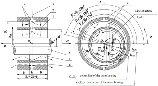 A radial bearing with a floating ring consists of two bushes: a fixed bearing bush; and a loosely inserted bush separating the journal and the fixed bearing bush, which is further referred to as a floating ring. Oil is supplied under pressure to the circumferential grooves of the outer and inner bearings through two holes in the fixed bearing bush and four holes in the floating ring. The circumferential lubrication grooves in the bushes make it possible to evenly supply oil to the lubrication gaps and are completely filled with oil. The bearing journal and the oil layer adjacent to the journal rotate at the angular speed ω1. The speed in the radial direction of successive layers of oil decreases and equals zero on the surface of the fixed bearing bush [17,18,19,20,21,22]. Therefore, the loosely inserted floating ring rotates at the speed ω2, which is different from the journal speed ω1. For a specific position of the centre of the journal and the floating ring in the state of thermo-hydrodynamic equilibrium, the speed will be determined by the following factors: the balance of forces and moments in the bearing, the angular speed of the journal ω1, the mass of the floating ring, the internal geometry of the bearing, the oil viscosity, etc. (Figure 3).