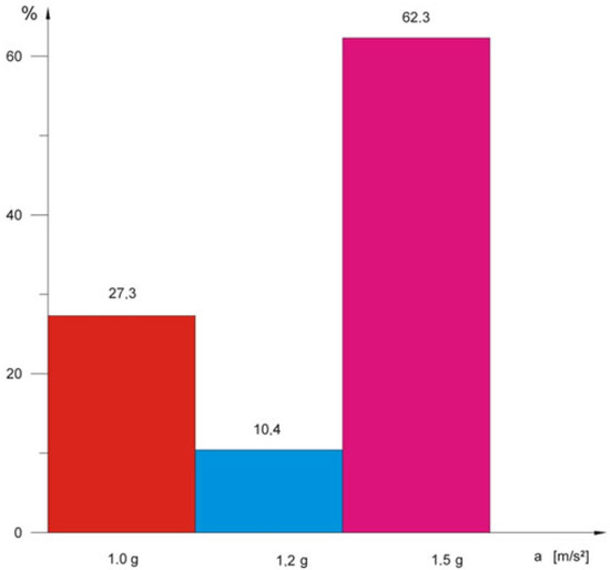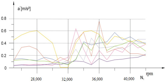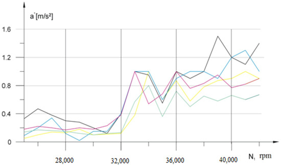 The results of the measurements of vibration accelerations as a function of the turbocharger’s rotational speed showed that there are two resonance zones for amplitudes of vibration accelerations up to 1.5 g (Figure 6), and one zone for amplitudes of vibration accelerations up to 0.8 g (Figure 7). In both cases the zones are close to the operating speeds of the turbocharger. The individual colours on the charts illustrate example changes in the acceleration amplitude of the rotor speed function for the turbochargers selected for the tests.