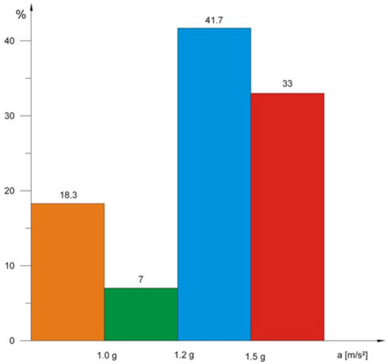 By making an analogous analysis for the entire group of tested turbochargers (115 units), it was established that the value of vibration accelerations for 18.3% of the turbochargers was in range 1, 7% in range 2, and 41.7% in range 3, whereas 33% of the turbochargers exceeded the acceptable vibration values (Figure 5). This allowed for determining the percentage share of each range.