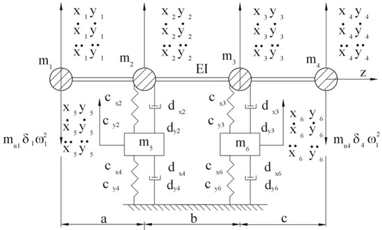Each of the rotors with continuously distributed masses was replaced by a point mass located in the centre of the mass. The compressor rotor was replaced by the mass m4, whereas the turbine rotor was replaced by the mass m1. The distributed mass of the shaft was replaced by two masses, m2 and m3. The floating rings were replaced by the masses m5 and m6. The sections of the shaft between the supports were treated as elements with constant stiffness E∙I. The exciting forces acting on the masses m1 and m4 were the forces of gravity and forces caused by the imbalance of the rotating masses. The effect of the dynamic imbalance [14] was omitted, based on the assumption that the additional masses mn1 and mn4 are located at distances δ1 and δ4, respectively. Consequently, each point mass is a source of an external exciting force equal to mn1∙δ1∙ω12 and mn4∙δ4∙ω12. At the same time, it was assumed that these forces do not work in one phase, and the phase shift angle is φ.