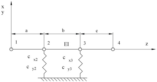 The impact factors αxrs and αyrs (where x is the plane OXZ, y is the plane OYZ, r = 1, 2, 3, 4, and s = 1, 2, 3, 4) incorporated into the mathematical model of the bearing unit are deflections measured in the s-th point, resulting from the application of the unit force F = 1 (N) in the r-th point (Figure 9).