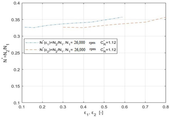 Figure 10 shows the impact of the relative eccentricities ε1 and ε2 of the oil film on the speed quotient, N*.