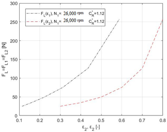 The authors of this paper used these parameters to calculate the impact of the relative eccentricities ε1 and ε2 of the film on the speed quotient N* in the static equilibrium position for N1 = 26,000 rpm, N1 = 34,000 rpm, N1 = 420,000 rpm, and ε = 0.8 (Table 2).