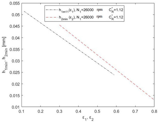 Figure 12 shows the impact of the relative eccentricities ε1 and ε2 of the oil film on changes in the minimum hight of the oil film, h1,2min.