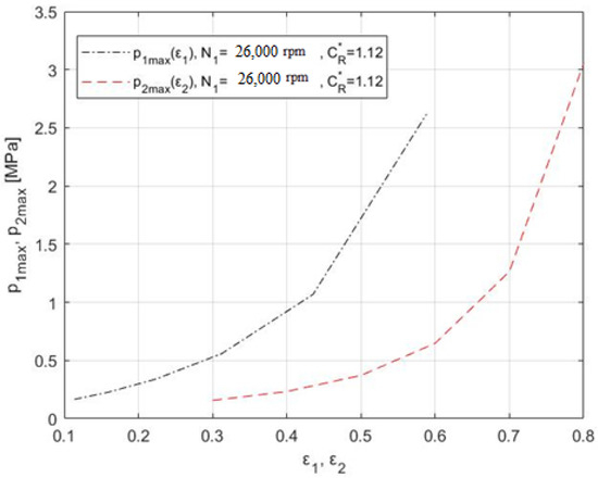 Impact of the relative eccentricities ε1 and ε2 on the maximum oil pressures p1max and p2max. Source: own elaboration.