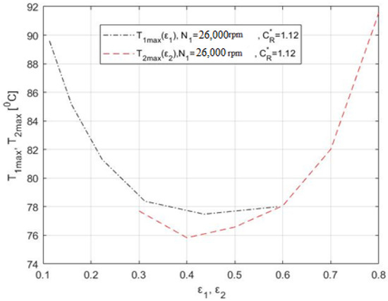 Impact of the relative eccentricities ε1 and ε2 on the maximum oil temperatures T1max and T2max. Source: own elaboration.