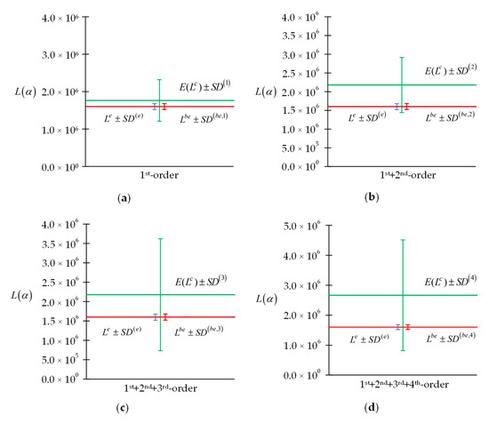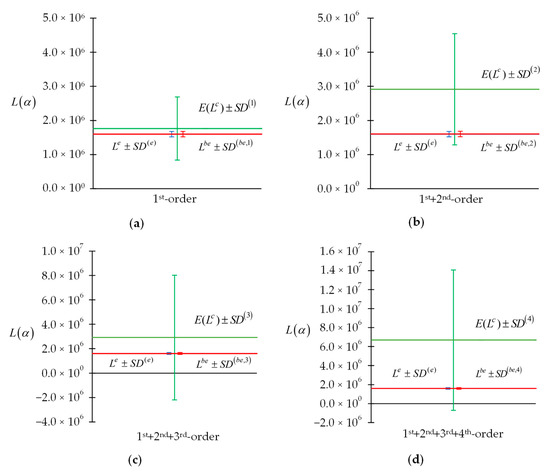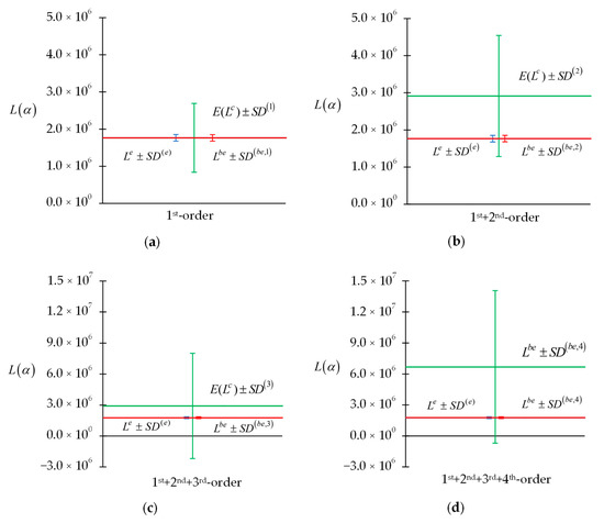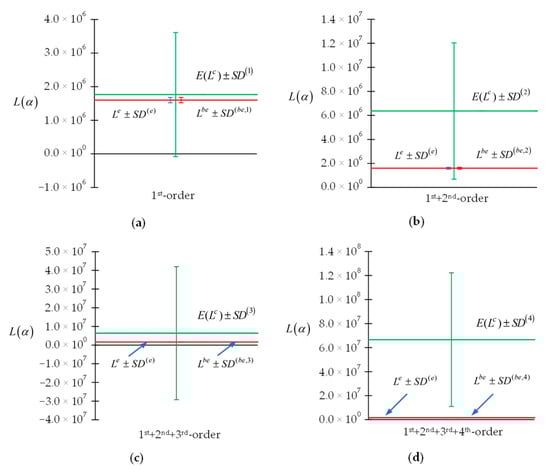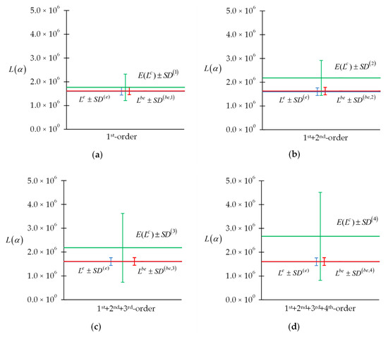 Comparison of (in green), (in red), and (in blue), for response measurement , parameters . (a) Only the 1st-order () sensitivities are considered. (b) The 1st + 2nd-order () sensitivities are included. (c) The 1st + 2nd + 3rd-order () sensitivities are included. (d) The 1st + 2nd + 3rd + 4th-order () sensitivities are included.