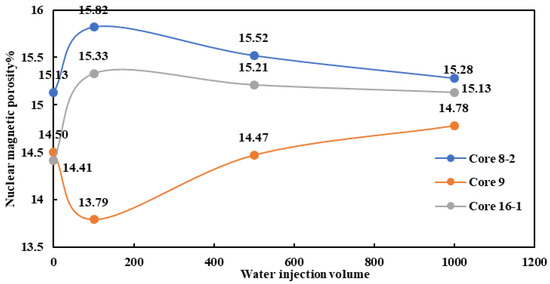 Due to the proportional relationship between the amplitude of the nuclear magnetic signal and the number of hydrogen nuclei (i.e., fluid content) contained in the sample (pore), the T2 spectrum of nuclear magnetic resonance can be used to calculate the nuclear magnetic porosity. The method for measuring porosity this time is the peak method. Firstly, we measured the nuclear magnetic resonance T2 spectrum of the standard sample (with porosity of 1%, 2%, 5%, 10%, 15%, 20%, and 25%, respectively), established a scale system between the nuclear magnetic resonance signal amplitude and porosity, and then measured the rock sample. We substituted its signal amplitude into the scale relationship equation to calculate the nuclear magnetic resonance porosity. Figure 1 shows the relationship between the cumulative water injection volume of the core and the nuclear magnetic porosity. The figure shows that the nuclear magnetic porosity changes of the three target cores exhibit different patterns of change. In the first stage (saturated water state—cumulative water injection of 100 PV), the NRM porosity of core 8-2 and core 16-1 shows an upward trend with the increase in water injection, increasing from 15.13% and 14.41% to 15.82% and 15.33%, respectively, while the NRM porosity of core 9 decreases from 14.5% to 13.79%. In the second stage (cumulative water injection of 100–1000 PV), with the increase in cumulative water injection, the NRM porosity of core 8-2 and core 16-1 decreases from 15.82% and 15.33% to 15.28% and 15.13%, respectively, while the porosity of core 9 increases from 13.79% to 14.78%.