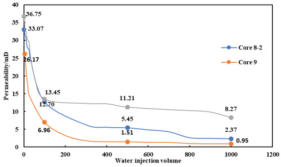 Figure 2 shows the relationship between the cumulative injection rate of the core and the permeability (water). The variation pattern of permeability shows that with the continuous increase in cumulative water injection, the overall permeability shows a downward trend. In the first stage (saturated water state—cumulative water injection of 100 PV), the permeability of the three core water blocks decreased significantly, from 33.07 mD, 26.17 mD, and 36.75 mD to 12.70 mD, 6.96 mD, and 13.45 mD. In the second stage (cumulative water injection of 100–1000 PV), the permeability decreased slightly with the cumulative water injection account increase, and the decrease was 10.33 mD, 6.01 mD, and 5.18 mD, respectively. The reason for this phenomenon is that flowing water transports detached clay minerals and particles, leading to a decrease in core permeability. Low permeability reduces the ability of water to transport clay minerals and particles (low permeability weakens the fluidity of water, and water can transport fewer particles with smaller radii). Therefore, the change pattern of core permeability with water injection rate is that it decreases rapidly in the early stage of water injection, and gradually stabilizes after a slow decrease in the later stage of water injection.