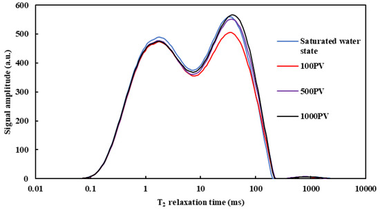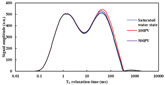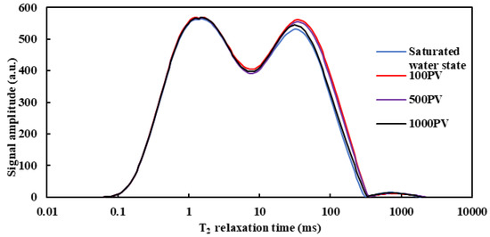 Figure 5 shows the NMR T2 spectrum of core 9 under different water injection multiples. It can be seen that in the state of cores saturated with water, its T2 spectrum is double-peak. The signal intensity is the highest under conditions in small pores, and the signal intensity decreases from the saturated water state to the cumulative water injection volume of 100 PV. The signal intensity remains unchanged basically during the subsequent continuous water injection process. The signal intensity in medium and large pores decreases first and then increases with the increase in water injection volume. The signal intensity decreases from the saturated water state to the cumulative water injection volume of 100 PV and gradually increases during the subsequent water injection process. The change law of the NMR T2 spectrum under different water injection multiples shows that in the first stage (saturated water state—cumulative water injection volume of 100 PV), due to the high content of clay minerals in the core (up to 4.76%), the volume of clay minerals becomes larger after water swelling during water injection, leading to the reduction of pore volume, water content in pores, and signal intensity; In the second stage (cumulative water injection volume of 100–1000 PV), with the continuous increase in cumulative water injection, the clay minerals and particles that fall off after water swelling migrate (migrate to the outlet section), resulting in an increase in water volume in this range, an increase in the signal intensity, and a right shift in the corresponding curve. The change law of the T2 spectrum is consistent with the trend of nuclear magnetic porosity.