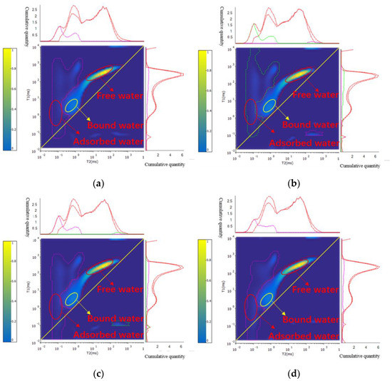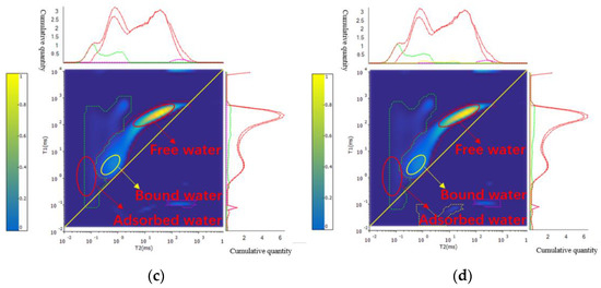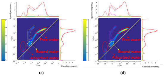 Core 16-1 NMR 2D spectra. (a) Saturated water state; (b) water injection of 100 PV; (c) water injection of 500 PV; (d) water injection of 1000 PV.