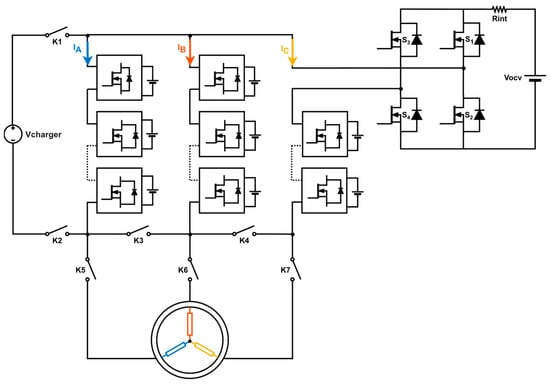 While recent research has mainly focused on the direct link between the grid and converter, known as vehicle to grid (V2G), the most prevalent charging infrastructure still relies on DC chargers, which control the entire power flow to the battery pack []. Consequently, determining the DC charging algorithm for multilevel converters has become an urgent topic. A configurable modular multilevel converter (CMMC) is proposed for both motoring and charging phases in EV powertrains []. Specifically, the battery system is divided into multiple submodules, and the motor windings act as filters during the charging operations. However, electronic components and the resulting power losses are greater compared to the cascaded H-bridge (CHB) topology.