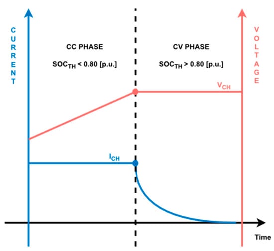The state of charge (SOC) of the battery modules serves as a crucial parameter for identifying the two stages of the charging process. A common practice is to maintain a constant current phase until the SOC value of the battery module reaches a predetermined threshold value (SOCth = 0.80 p.u.). The constant voltage phase continues until the current falls below a predefined level (). The choice of the SOCth value ensures that the initial charging current in the constant voltage phase is equal to or lower than the one used in the constant current phase.