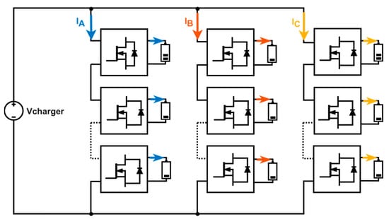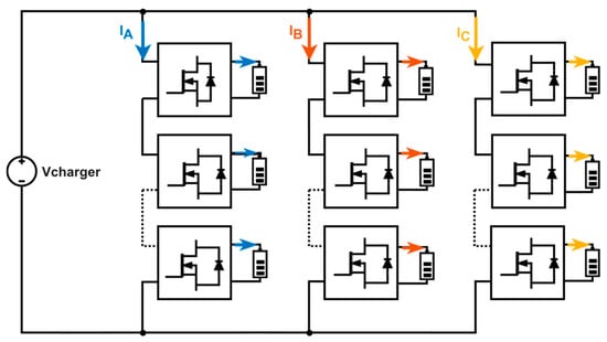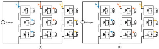 - All SOC values are lower than SOCth. The constant current stage begins. The output voltage of the DC charger is controlled to ensure that the maximum current flowing in the less charged phase is equal to . As a result, smaller currents pass through the other two phases, with their values depending on the SOC values of the installed battery modules. During this phase, all H-bridges are set to the active mode to charge their respective battery modules, as shown in Figure 3.