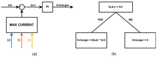 Managing the output variables of the DC charger poses a significant challenge in the proposed algorithm. Specifically, the allocation of the DC charger’s output current among the three phases is determined by the SOC values of the battery modules. Controlling all four currents simultaneously (charger and phase currents) would be exceedingly complex due to their strong interdependence.