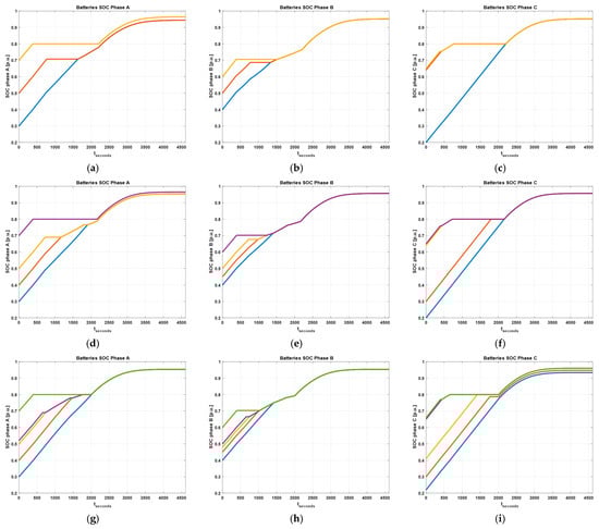 The starting SOC values are listed in Table 2 and their behavior through the charging stages is shown in Figure 8a–c (three submodules per phase), Figure 8d–f (four submodules per phase), Figure 8g–i (five submodules per phase).