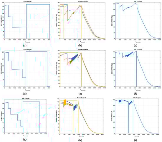 Behaviors of 3 submodules per phase case during the charging protocol: (a) DC charger voltage, (b) phase currents, (c) DC charger current. Behaviors of 4 submodules per phase case during the charging protocol: (d) DC charger voltage, (e) phase currents, (f) DC charger current. Behaviors of 5 submodules per phase case during the charging protocol: (g) DC charger voltage, (h) phase currents, (i) DC charger current.