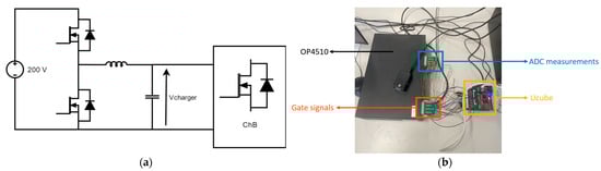 (a) Buck converter to perform the DC voltage charge; (b) experimental set-up: OP4510 and UCUBE platform.