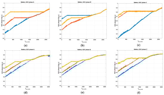 In the second scenario, the initial imbalance is consistent across phases, resulting in similar SOC trends among the different phases, as depicted in Figure 12d–f.