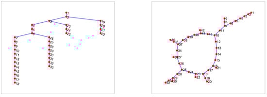 For this article, the data of two distribution systems– The IEEE33-bus system (I33) and the modeled distribution network for the neighborhood “Juan 23” (J23), located in San Andres Island (Colombia)–parameterize the AC-OPF formulations. The J23 system was modeled from data provided by the EM&D research group. The I33 system has a total demand of 3715 kW and 2300 kVAr with 210.9876 kW power losses (see system data in []) with a rated voltage of 12.66 kV, whereas the J23 system, with 13.6 kV rated voltage, totals 1302 kW and 593 kVAr in demand and 31.30 kW in power losses (see system data in Table A2 in the Appendix A). Each respective rated voltage and 1 MW (for both systems) are used as base values. If a multiperiod power flow analysis (see Equation (13)) is carried out with the demand following the mean averaged hourly profile ( in Table A1), then the losses sum up to 1.51 MWh/day for the I33 system and 337.25 kWh/day for the J23 system. As can be observed in Figure 2, the I33 and J23 systems have radial and radial/ring configurations, respectively.